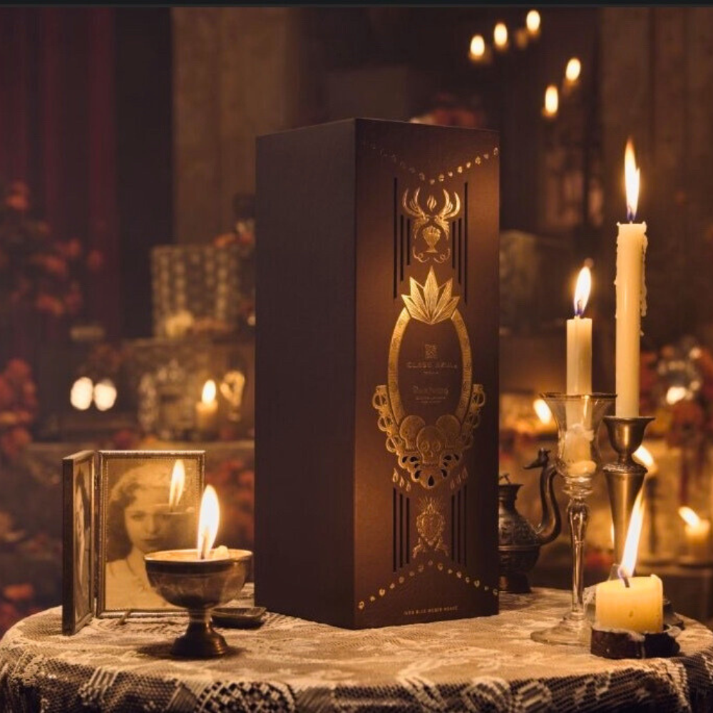 The ivory-colored decanter symbolizes remembrance through muted tones and elegant restraint. The base illustration, by artist Erika Rivera, depicts a family ofrenda adorned with cempasúchil flowers, pan de muerto, papel picado, sugar skulls, and candles—each an emblem of memory. The soft silhouettes of spirits watch over, present yet intangible, reflecting the emotional heart of Día de Muertos.